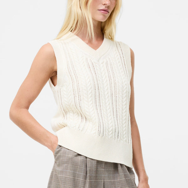 Our Glinda Cable Knit Vest is a popular piece. This sleeveless vest feature a front with delicate cable knit and airy pointelle detailing alongside ribbed trims.