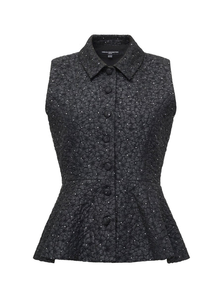 Introducing our sculpted and shimmering Yelena Jacquard Peplum Waistcoat Top. This sleeveless top features a flattering peplum shape in tactile floral texture, dotted with delicate hotfix diamantes for subtle sparkle.