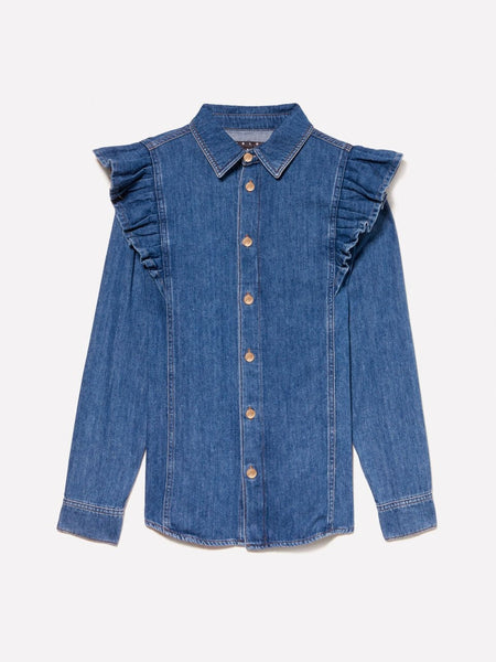 Blue regular fit shirt in denim 100% cotton, with a stone wash. Collar, front closure with snap buttons and long sleeves with frill motif on sleeves.